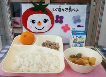 →今日の給食では、鶏肉、うずら卵、ごぼう平天、じゃがいも、こんにゃく、あつあげ、だいこん、にんじんが使われています。