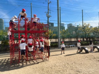 なわとびやこていしせつあそびの学習をしました。少しずつ前とびや後ろとびが跳べるようになってきました。こていしせつあそびでは、タイヤやのぼり棒などで登ったり飛び越えたりして体を動かしました!