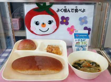→今日の給食は、あげたさけにマリネ液をからませた「さけのマリネ」です。