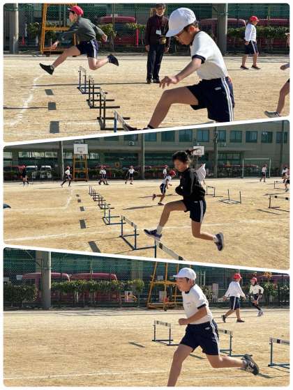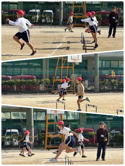 今まで練習してきた0.1.2.3を意識しながら、ハードルを何度も跳んで走っていました。