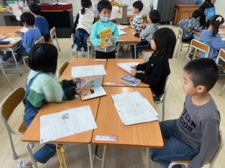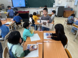 すきなおはなしはなにかなの学習をしました。自分がみんなに紹介したい本を選び、紹介カードを書きました。その紹介カードを班やみんなに発表しました。友達の紹介カードを聞いて、「読みたくなった。」や「お話の続きが気になった。」などと言って楽しんでいました!