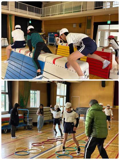 今日は、3学期初の体育でした!今回は講堂で、サーキットをしました!跳び箱、フラフープ、ロイター板などさまざまなものを使って身体を動かしました。最初は寒い寒いと言っていましたが、だんだん身体が温まってきて、熱くなっていました!