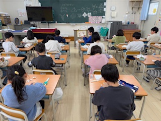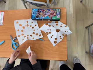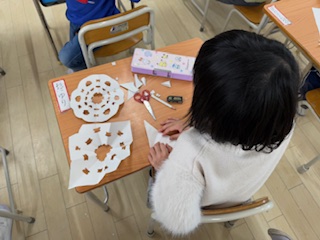 図工の時間にゆきの結晶作りをしました。紙を折って、模様を描いて、切って、広げてみるとみんな違うゆきの結晶が出来上がりました。「本物の結晶みたい。」と作ることを楽しむ様子が見られました!