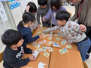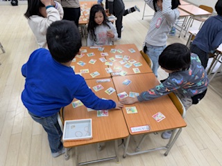 昔遊びのかるたあそびをしました。えふだを読む人を決め、読まれたえふだを素早く見つけてとっていました。とるときに、「はい!」という元気な声が教室に響いていました。誰よりも早くとろうとみんなものすごく集中をしていました!