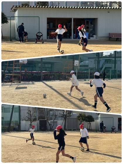 その後、サッカーの練習です。ボールタッチやドリブルの練習をしてからペアでパス、ドリブル、シュートを組み合わせた練習をゴールに向かって行いました!何度も繰り返すうちに、ドリブルもパスもシュートもどんどん上達していきました!