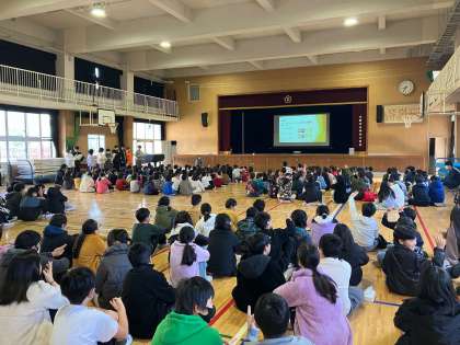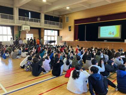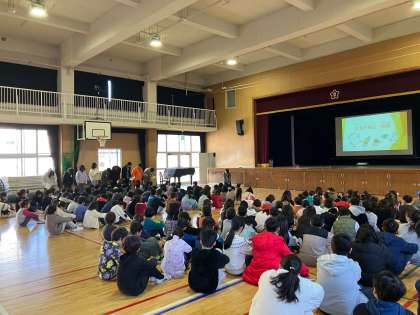 今日の児童集会は、給食委員会の発表でした。給食で出る果物の数や、調理員さんの人数などいろいろなクイズがありました。調理員さんたちは、8時ごろから給食の準備をしていることに驚きました。