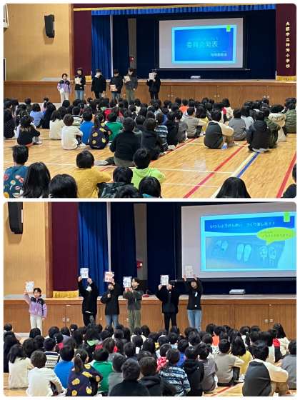 また、今日は環境委員会のお友だちの発表もありました。環境委員会からは、「トイレのスリッパをそろえましょう。」という発表でした。次に使う人が気持ちよく使えるようにみんなで協力しましょうね。