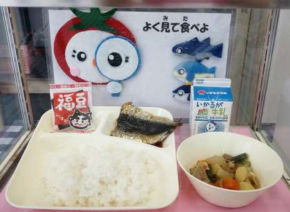 ◎給食では、節分の行事献立として「いわしのしょうがじょうゆかけ」と「いり大豆」が出ます。