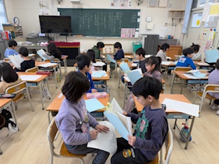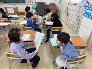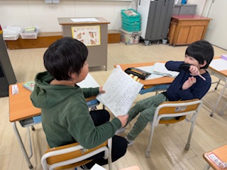 おもい出してかこうの学習をで、今日はペアで原稿用紙に書いた文章を読み合いしました。声の大きさやはやさなどに気を付けながら読んだ後、友達の文章や読み方の良いところを見つけて伝え合いをしました。大きな声でハキハキ読んだり、友達の良いところをたくさん見つけてたりすることができていました!