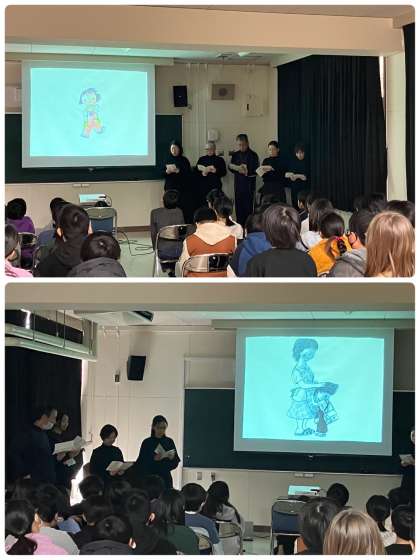 今日「絵本のくに」のみなさんが絵本を3冊読んでくれました。普段の読み聞かせとは違って、スクリーンに絵を映して読んでくれました。そして、なんと、担任の先生と校長先生も読んでくれました。新鮮でとても良かったです。また聞きたいと思いました。