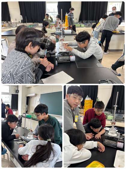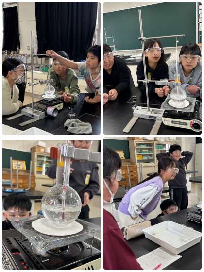 どんどん沸騰していく様子に少し怖がりながら、温度や水の様子をしっかり観察していきました。泡が出た!、沸騰石が動いてる!など実験をしながらさまざまなつぶやきがありました。教科書や動画だけでなく、実際に実験してみることは、すごく大切ですね。楽しく協力して実験することができました!