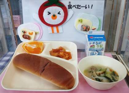 給食の中華がゆは、米のほかに肉だんご、チンゲンサイ、だいこん、にんじん、しいたけが入っています。