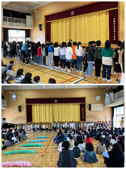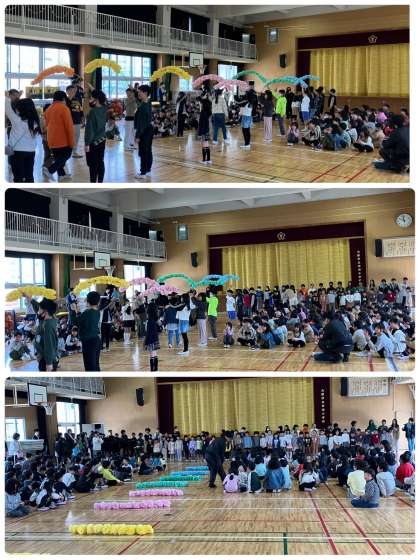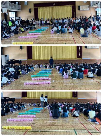 はじめ6年生が手をつないで入場してきました。そして、迎える言葉、お礼の言葉があり、プレゼントを渡しました。