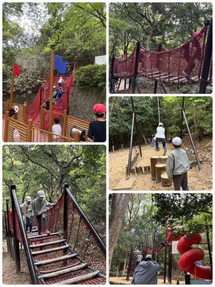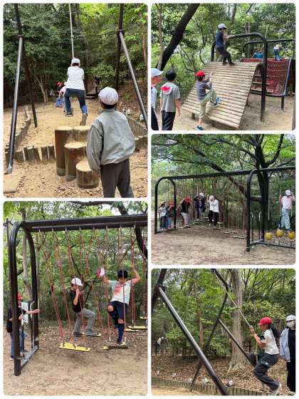 まず公園についてからアスレチックで遊びました!約30個のアスレチックがあり、子どもたちは大喜びでした。何周も回って汗だくになるまで遊びました!