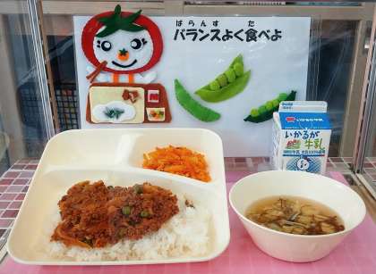→給食では、細切りにしたにんじん、ささみ、かつおぶしと調味料を混ざ合わせ、焼き物機で焼きます。卵は使っていません。