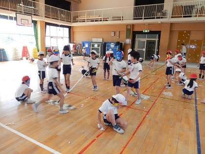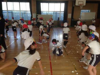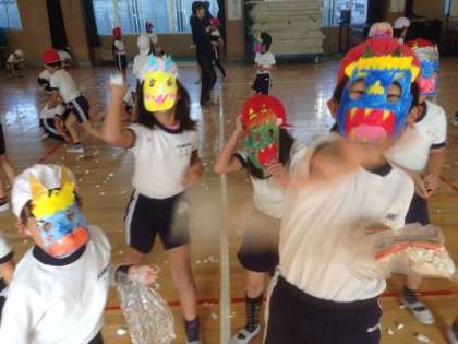 2月4日には、手作りの鬼のお面を付けて豆まきを行いました。ティッシュを丸めた豆を友だちに向かって・・・えいっ!「鬼は外!福は内!」子どもたちの元気な声が講堂に響きました。その後は生き残り鬼ごっこをして、講堂の後片付けをしました。楽しんだ後は、元通りきれいな講堂に戻して節分を祝う活動を終えました。