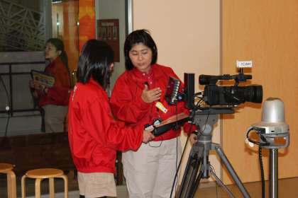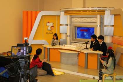 テレビ大阪のブースではアナウンサーとカメラマンに挑戦です。カメラのとり方を教えていただきました。アナウンサーは原稿を読むだけではなくにっこり笑顔も大切です。毎日、見ているニュース番組の裏側を知ることができました。