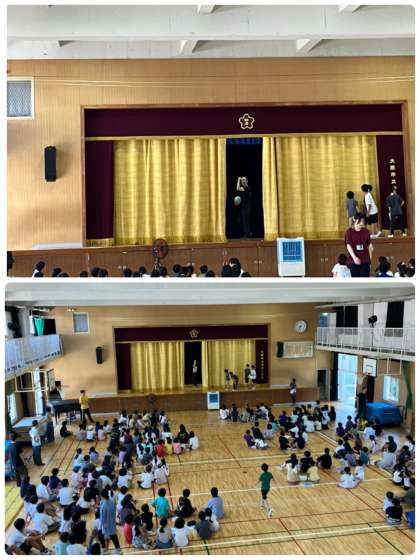 舞台上の幕と幕の間を先生に通ってもらい、誰が当てるゲームです。先生が通るたびに歓声が起こり、大変盛り上がりました。