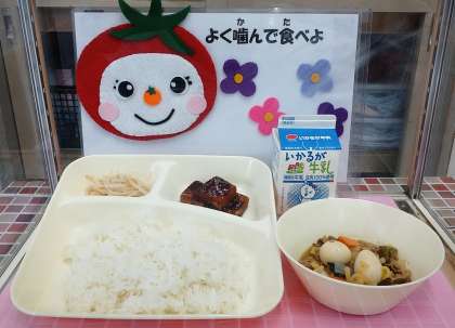 給食では、豚肉、うずら卵、キャベツ、たまねぎ、にんじん、たけのこ、ピーマン、しいたけの8種類を使っています。