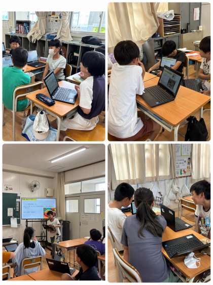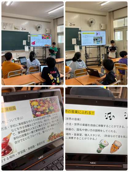 今日は、4月から学習してきた未来の学校について考えようの発表を行いました。スライドを用いてグループで交流してから、全体発表をしました。なかなか難しい学習でしたが、スポーツや農業、料理、AIなど未来の学校で学びたいことを1人1人が真剣に考えることができました。