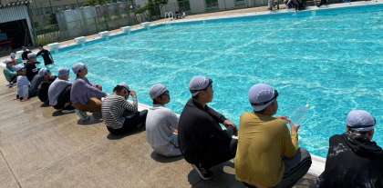 ペットボトルを使って、顔を水につけずに浮く学習もおこないました。
