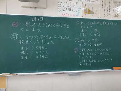 三つの小学校の子どもの人数を東小と西小、西小と南小で比べ数の大小を不等号を使って表すことができました。