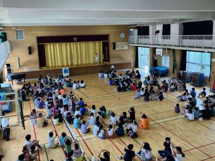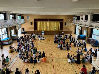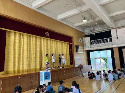 集会委員会のお友だちが出した問題にみんなが大きく○×を出します。正解を言われるとみんな大盛り上がりでした。