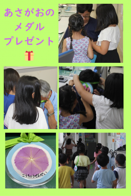 1年生が、自分たちで育てたあさがおからメダルをつくり、職員室・校長室へみんなでもってきてくれました!