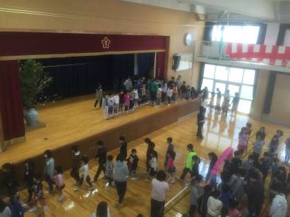 はじめて講堂に1年生から6年生の全校児童がそろいました。