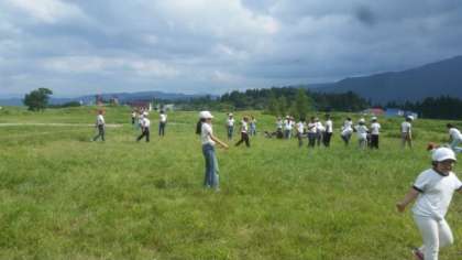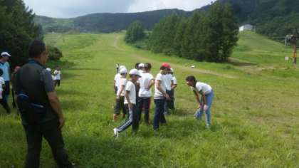 二日目の高原散策は、昨日より平らな場所で行いました。草むらでバッタとりに興じる五年生たちです。