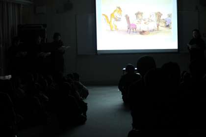 今回の絵本は、大型絵本の『ここがせかいいち!』、プロジェクターでの『きつねのおきゃくさま』と『手ぶくろを買いに』の3冊でした。多目的室に集まった子ども達は、絵本のくにの方々の声に誘われてお話の世界に浸っていました。