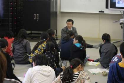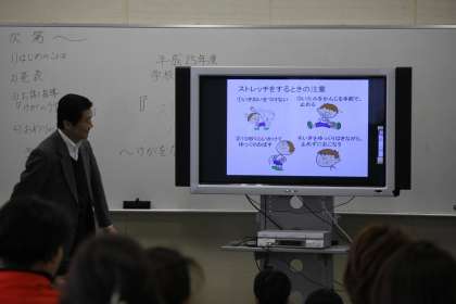 保健委員会の子どもたちからの発表に続いて、学校医の井上康則先生から「けがの予防」についてお話がありました。実際に、体を動かしてストレッチをしながら怪我をしないで楽しく運動しましょうというお話がありました。寒くなってきたこの時期には、知らず知らずのうちに、力が入って体が硬くなりがりです。ゆっくりストレッチをして体を柔らかくして健康に過ごしたいですね。