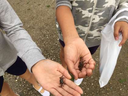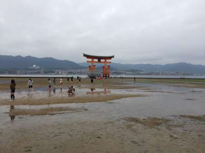 厳島神社の見学へ出かけました。干潮の時間でしたので、鳥居を間近に見ることができました。生き物と触れ合うこともできました。