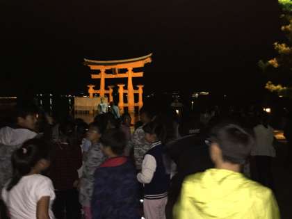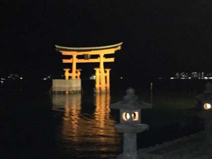 厳島神社の鳥居がライトアップされています。写真では、わかりにくいですが、とても綺麗です。
