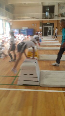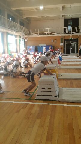 跳び箱運動をしました。両手でしっかりと身体を支持できるように力を入れるところが大事なポイントです。