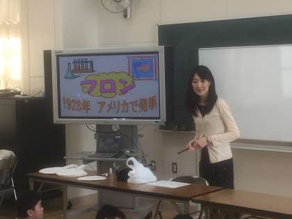 「なるほど!お天気・環境実験教室」というタイトルで、気象予報士の坂下恵理さん、久保智子さんが講師として来てくださいました。お二人は実際にテレビ局でお天気お姉さんとして働いているそうです。