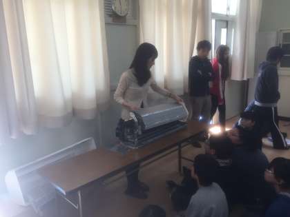 目の前でエアコンを解体してもらったり、学校の室外機を見にいったりしました。