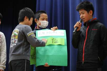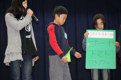 事前に全校児童に対して「好きな食べ物」と「嫌いな食べ物」を、アンケート調査した結果を1年生から順に学年ごとに発表してくれました。好きな食べ物には「カレー」や「お肉」が多く、苦手な食べ物には「ゴーヤ」「トマト」などがありました。苦手な食べ物もバランスよく食べるようにしましょうとまとめてくれました。