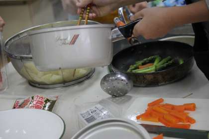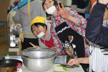 ジャガイモやニンジンなどの野菜とベーコンという身近な食材で、料理を班で協力して作っていました。みんなで作った粉ふきイモとジャーマンポテト、アスパラのベーコン巻きのお味は、どうだったでしょう?