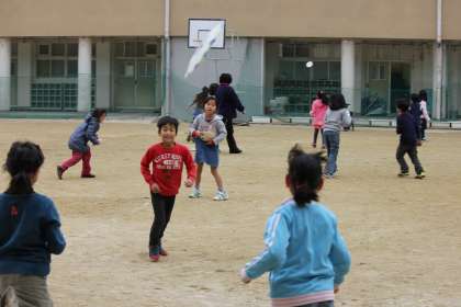 2月6日(木)校庭で雪がちらつく中、2年生の子どもたちが「おもちゃづくり」で作った手づくり紙皿UFOを飛ばして遊んでいました。
