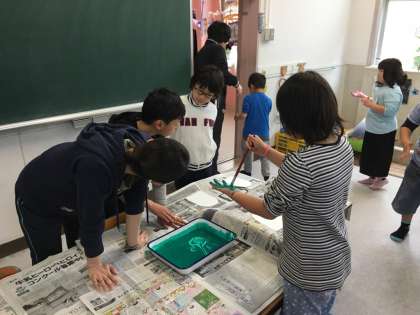 今日は、「こいのぼり作り」をしました。一人ひとり、こいのぼりのうろこに手形をおしました。黄色・緑色・ピンク色・黄緑色・黄土色の絵の具を使いました。色とりどりのこいのぼりのできあがりです。なかよし教室前に掲示します。来校された時にご覧ください。