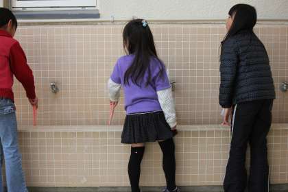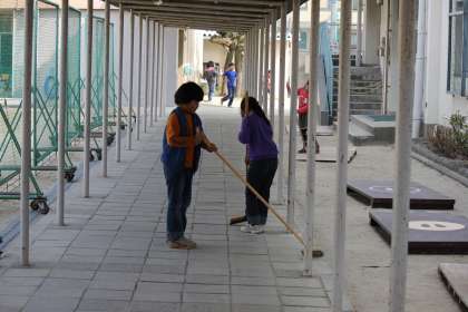 わたり廊下は、2年生がタイルの継ぎ目まで丁寧に砂や土をきれいに掃いてくれています。講堂の北側の手洗い場も2年生が担当しています。
