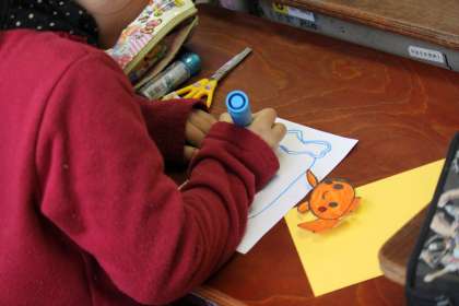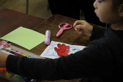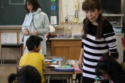 3月5日(水)2・3時間目に、2年生の教室で地域の山王さんと西尾さんに、「飛び出す絵カード」の作り方を教えていただきました。