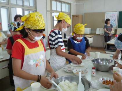 「みんなで協力して、楽しいおにぎりパーティーにしよう」をめあてに、おにぎりを作りました。一人ひとりのおにぎりに、いろいろな工夫が見られました。
