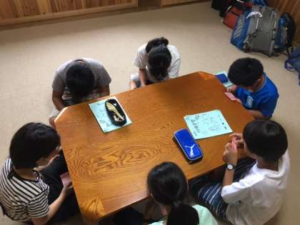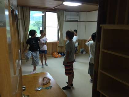 夜のキャンプファイヤーの出し物に向けて、各班が協力しながら練習をしています。最初は意見が分かれていた班も、一つの出し物が出来ていく過程を通して、どんどんと絆が深まっていく様子が見られます。(左の班はダンスを、右の班は怖い話を練習しています。)