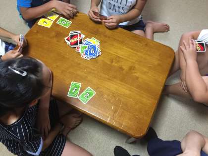 スタンツの練習が終わった班から、カードゲームで遊んでいます。ゲームは百人一首やウノやトランプです。白熱しています!
