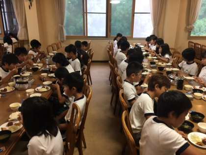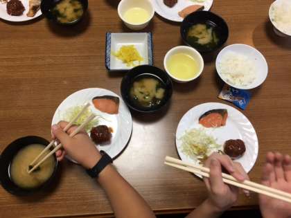 「ミートボールがめっちゃおいしい」、「ごぼうがちょっと辛いけどうまい」、キャベツがシャキシャキしてる」など言いながら食べています。