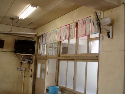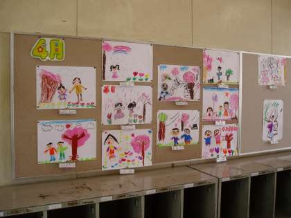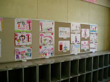 教室には、学校で楽しく遊んでいる様子を描いた絵が掲示されていました。