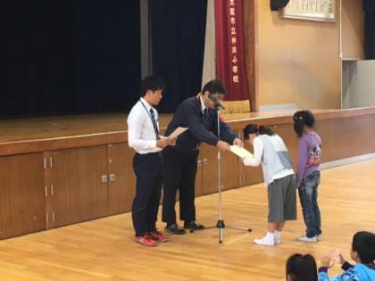 今日は、大阪府小学生バドミントン選手権大会で、優勝や準優勝した児童の表彰がありました。おめでとうございます。