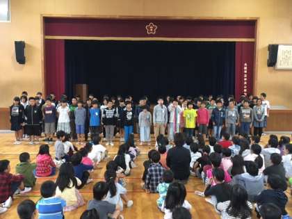 また、6年生より、みんなで作った完成した千羽鶴の報告と、平和への願いが込められた「地球星歌(ちきゅうせいか)」の歌の披露がありました。平和の強い思いが伝わりました。6年生の皆さん、気を付けて修学旅行に行ってきてください。